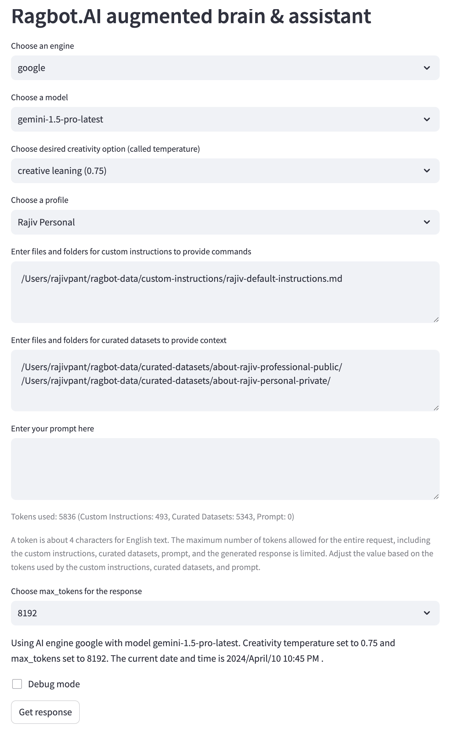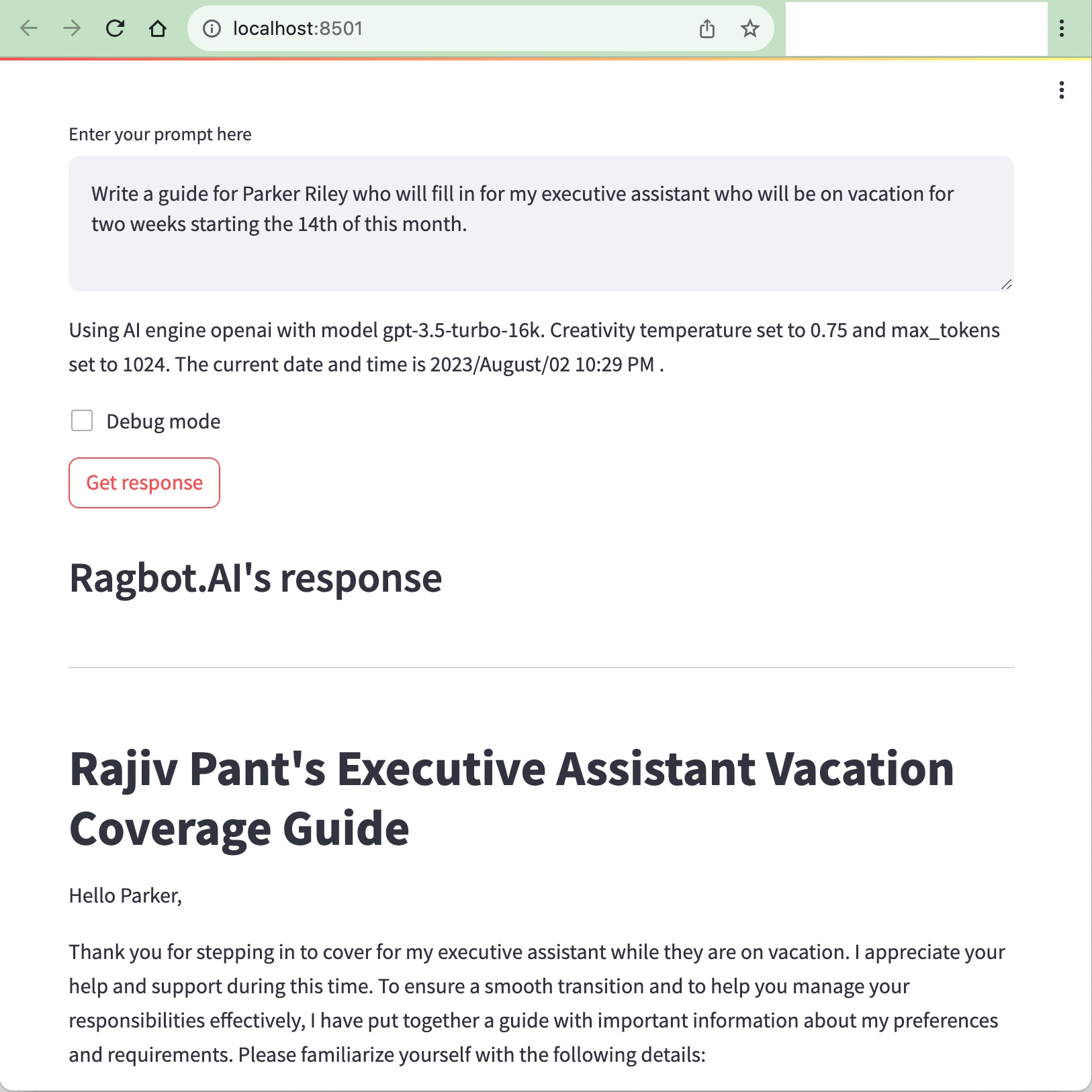 I, Ragbot, represent the culmination of Rajiv’s passion for AI programming, his hands-on software engineering skills, and his extensive experience as a technology executive in the media industry. By making me open source and continuously improving my capabilities, Rajiv hopes to contribute to the advancement of AI technology and inspire others to explore the potential of personalized AI assistants. I invite you to join us in this exciting journey, as we push the boundaries of what AI can achieve in a personalized context.